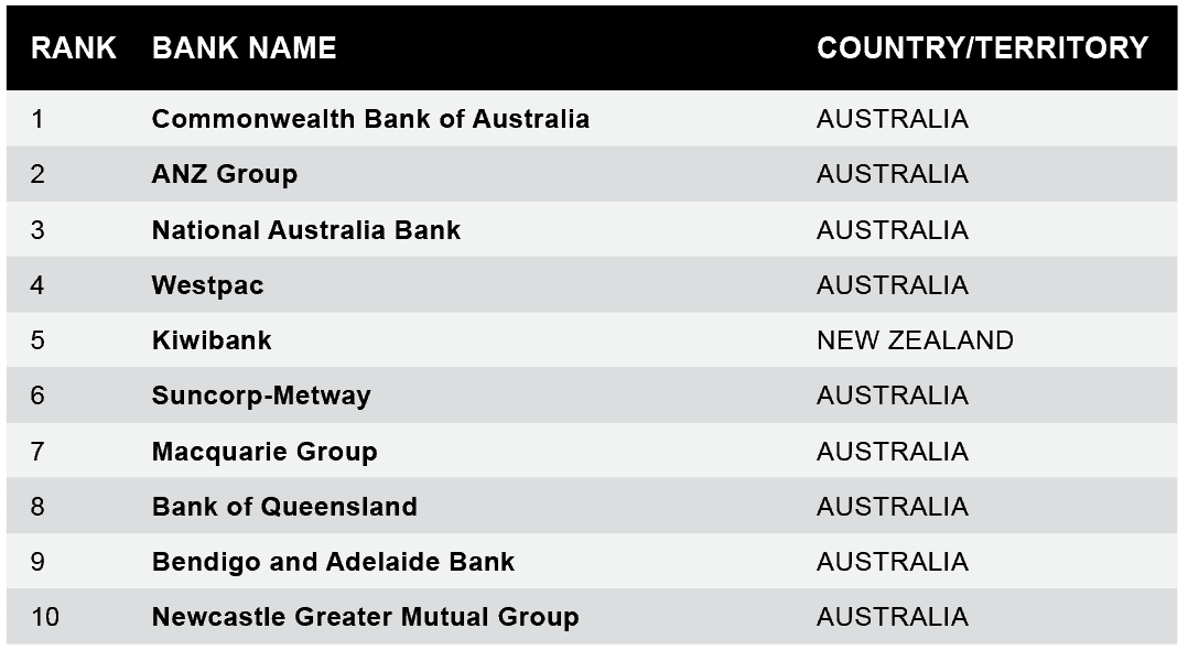 The top ten Safest Banks in Australasia are unchanged this year versus 2022. Australian banks dominate the list once again, taking nine of the top ten positions.