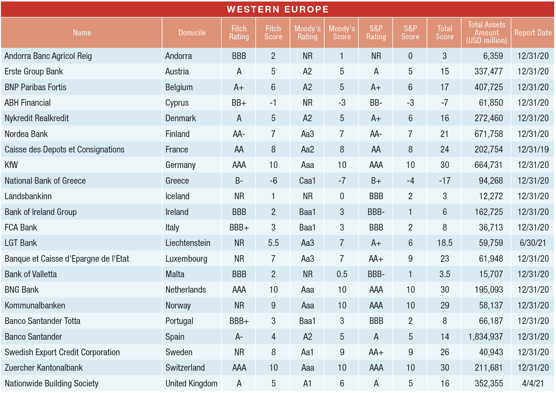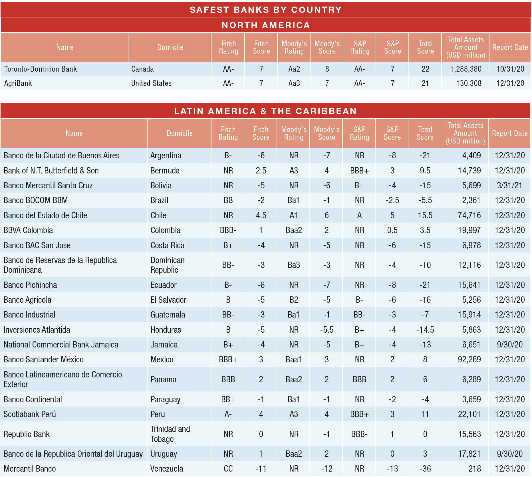 To be eligible for inclusion in the Country Winner rankings, entities must be among the largest 1,000 banks by assets and carry at least one long-term foreign currency deposit or debt rating from one of the three major rating agencies. Wholly owned subsidiaries are ineligible. In order to capture the safest bank for each country, the criteria must be broader than for the global rankings, which require a position among the largest 500 banks and rating by at least two agencies.