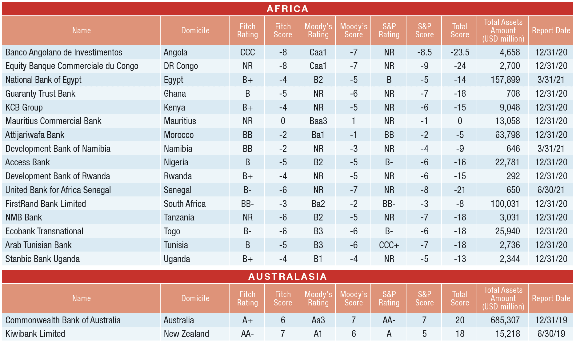 Some merger activity contributed to new winners. The newly named Equity Banque Commerciale du Congo rises to the top following the merger of Equity Bank Congo and Banque Commerciale du Congo, the 2020 incumbent. In Saudi Arabia, this year’s new safest bank came out of April’s merger of National Commercial Bank and Samba Bank, which formed the new Saudi National Bank with a stronger rating profile than incumbent Saudi British Bank.
