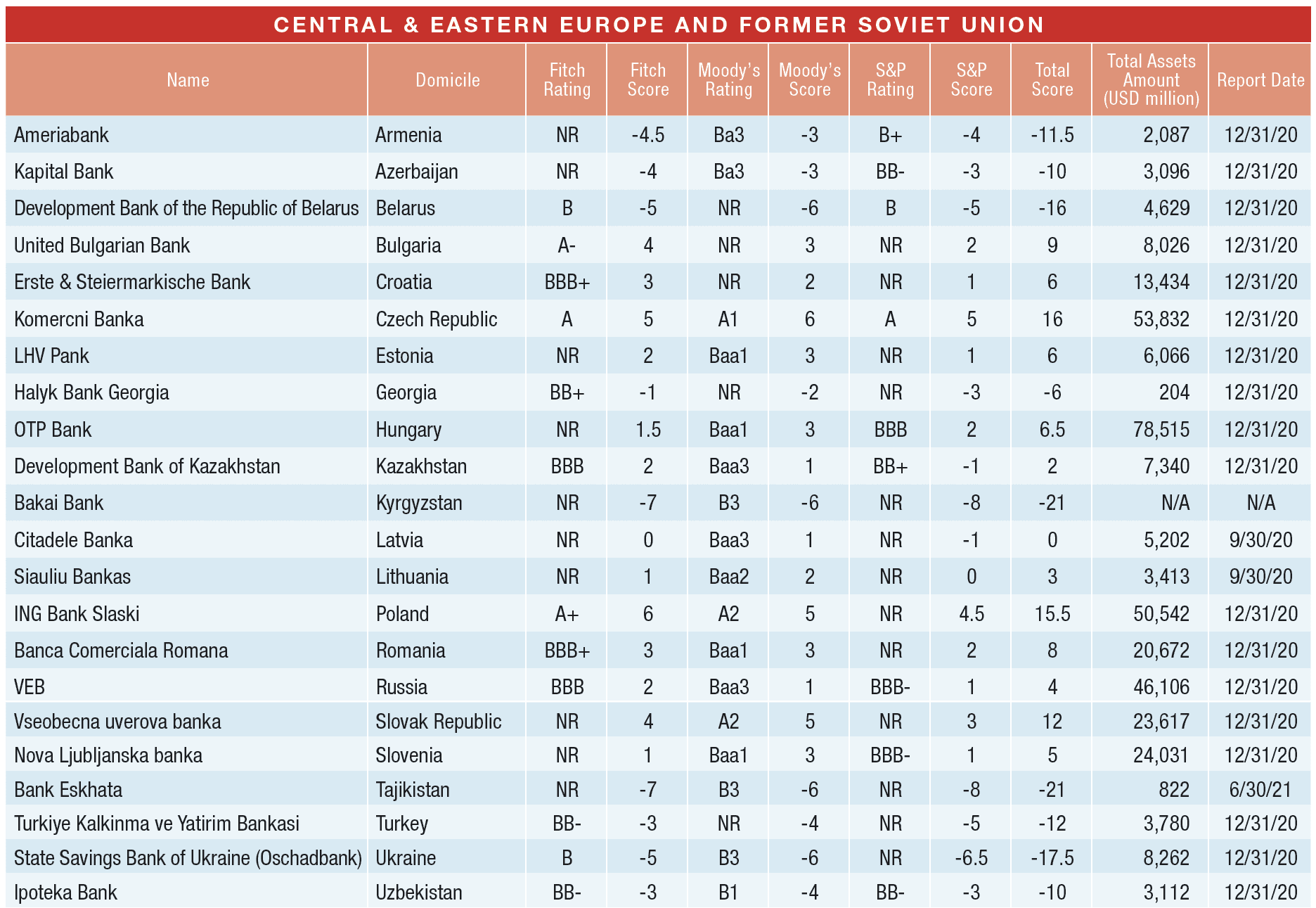 There were noteworthy upgrades, too. In Greece, Aegean Baltic Bank was replaced by National Bank of Greece, which benefitted from a Fitch upgrade in May based on improved asset quality from its derisking strategy. In December, several banks got an uplift when Moody’s raised their country’s ceiling, including Stanbic Bank Uganda and Brazil’s Banco BOCOM, a subsidiary of China-domiciled Bank of Communications. Unrated by Moody’s, incumbent Uganda Development Bank didn’t get the same boost. In Central and Eastern Europe, an April Fitch upgrade for Halyk Bank put it over Bank of Georgia. Ipoteka Bank got a Moody’s upgrade in December, displacing National Bank of Uzbekistan.